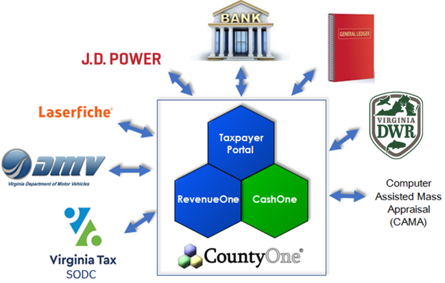 CountyOne contains three applications: RevenueOne, CashOne, and the CountyOne Taxpayer Portal. Together, they provide the tax processing and cashiering functionality required by Virginia’s Directors of Finance, Treasurers, and Commissioners of the Revenue.